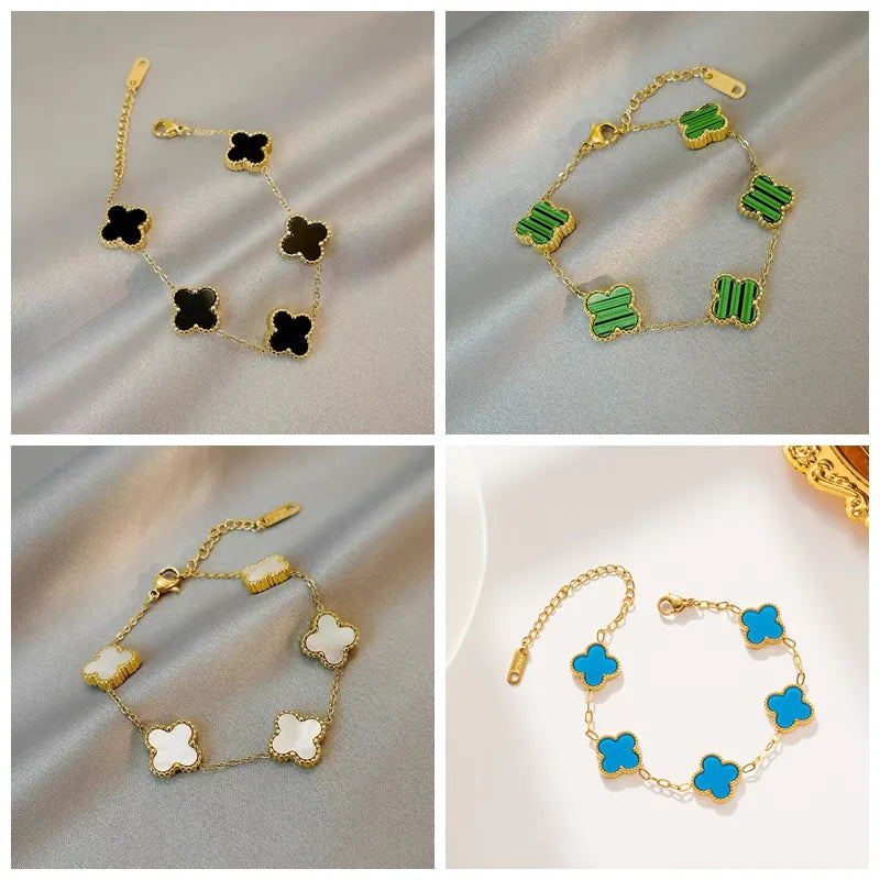 Ajoutez une note d’élégance à votre style avec notre ensemble exclusif de 4 bracelets plaqués or, conçus pour captiver et inspirer. Chaque pièce est fabriquée avec soin à partir d’agate porte-bonheur, rehaussée d’un délicat charm en forme de trèfle à quatre feuilles, symbole universel de chance.