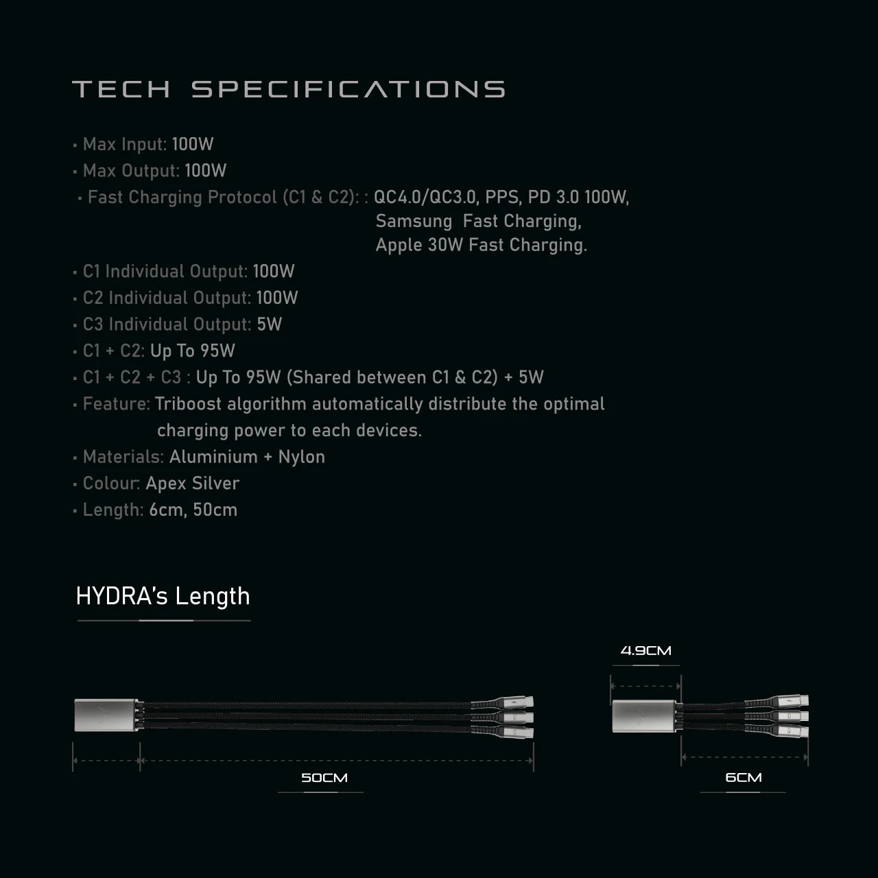 Pour une performance ultime, associez-le au câble Zeus-X Go et exploitez pleinement sa puissance de 100W. Ensemble, ils forment le duo parfait pour une charge rapide, fiable et efficace. Offrez à vos appareils le meilleur et rechargez l’esprit tranquille avec l’Adaptateur Hydra Triple Type-C !