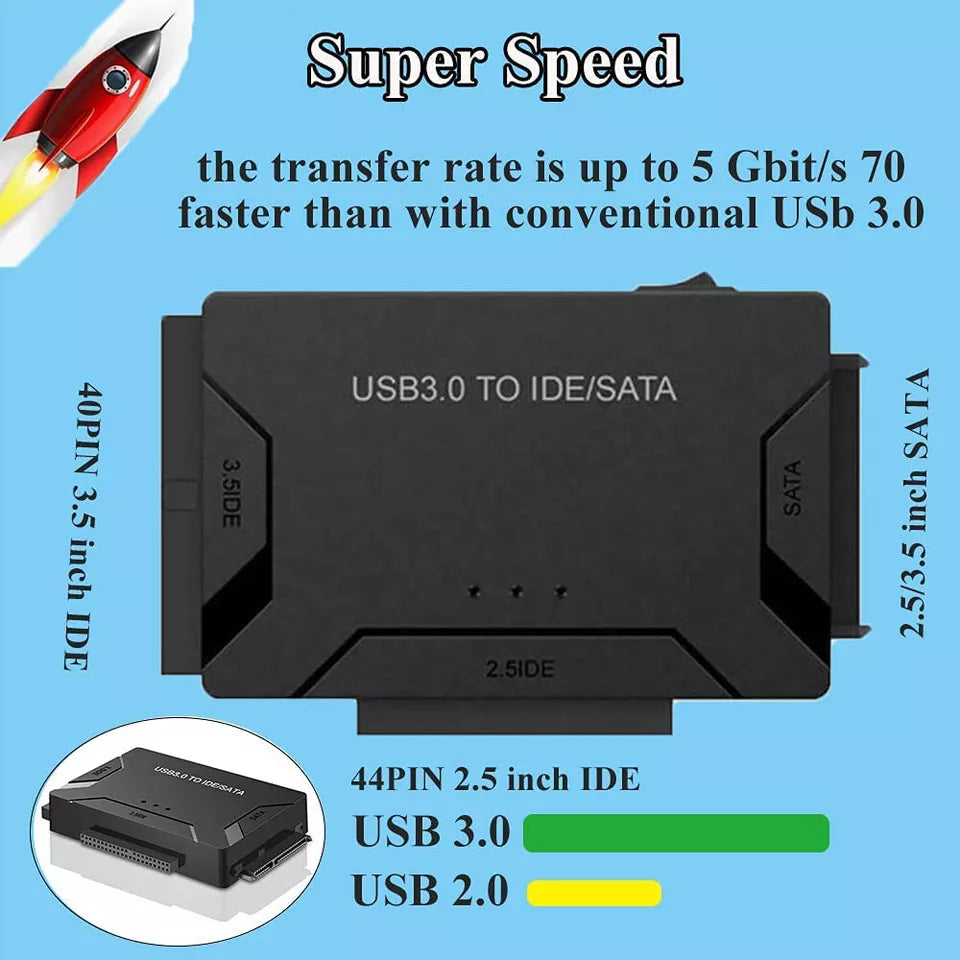Grâce à sa connexion USB 3.0 ultra-rapide, l’adaptateur accélère vos transferts de données, vous permettant de gagner un temps précieux. Il prend également en charge la lecture simultanée de trois disques, avec une capacité totale impressionnante de 6 To. Et si vous travaillez avec des disques IDE anciens, un simple réglage en mode "esclave" suffit pour leur donner une nouvelle vie.
