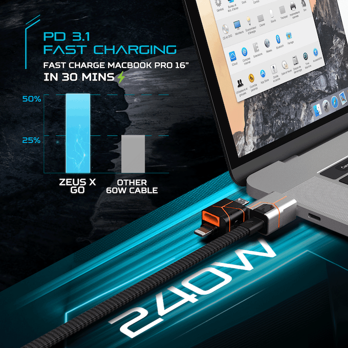 Fini les câbles emmêlés, les adaptateurs perdus et les recharges lentes ! Avec le Zeus-X Go Ultra, offrez à vos appareils une puissance et une rapidité incomparables. Grâce à sa charge ultra-rapide de 240 W, il propulse vos batteries à pleine capacité en un temps record. Plus besoin d’attendre des heures : branchez, chargez et repartez à l’aventure sans contrainte.