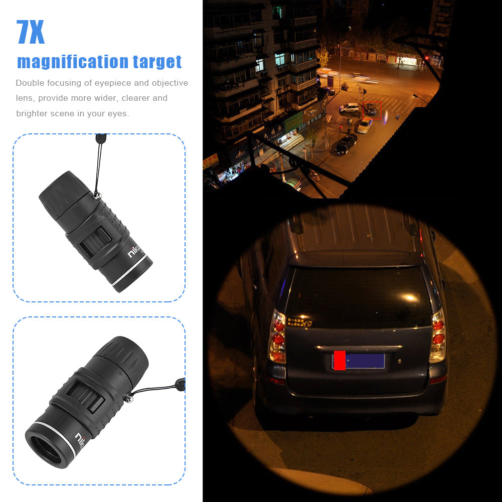 - Grossissement : 7 x 10 ; Champ de vision : 66 m/3000 m ; Champ de vision : 5,8 ° ; Taille du monoculaire : 83 x 33 x 33 mm.