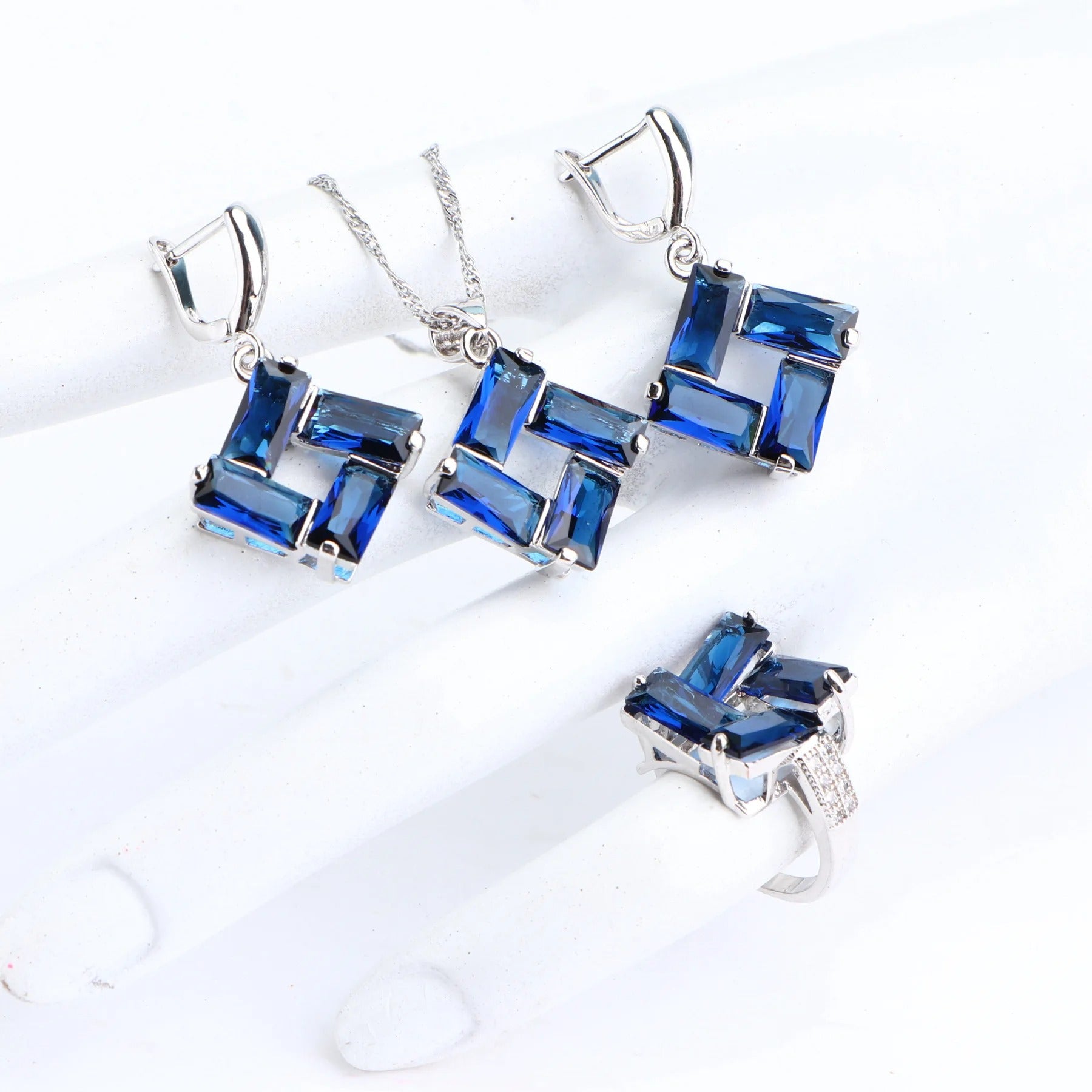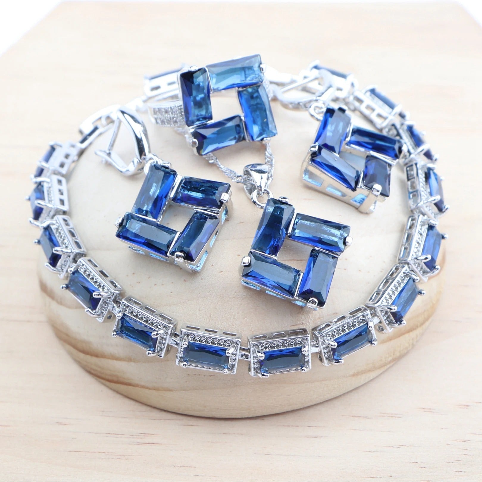 Cet ensemble de bijoux en zircon bleu a été imaginé pour sublimer chaque instant précieux. Composé d’un collier raffiné, de boucles d’oreilles étincelantes, d’un bracelet délicat et d’une bague majestueuse, il habille la femme moderne avec grâce et distinction. Chaque pièce s’harmonise parfaitement pour créer une allure élégante et inoubliable.
