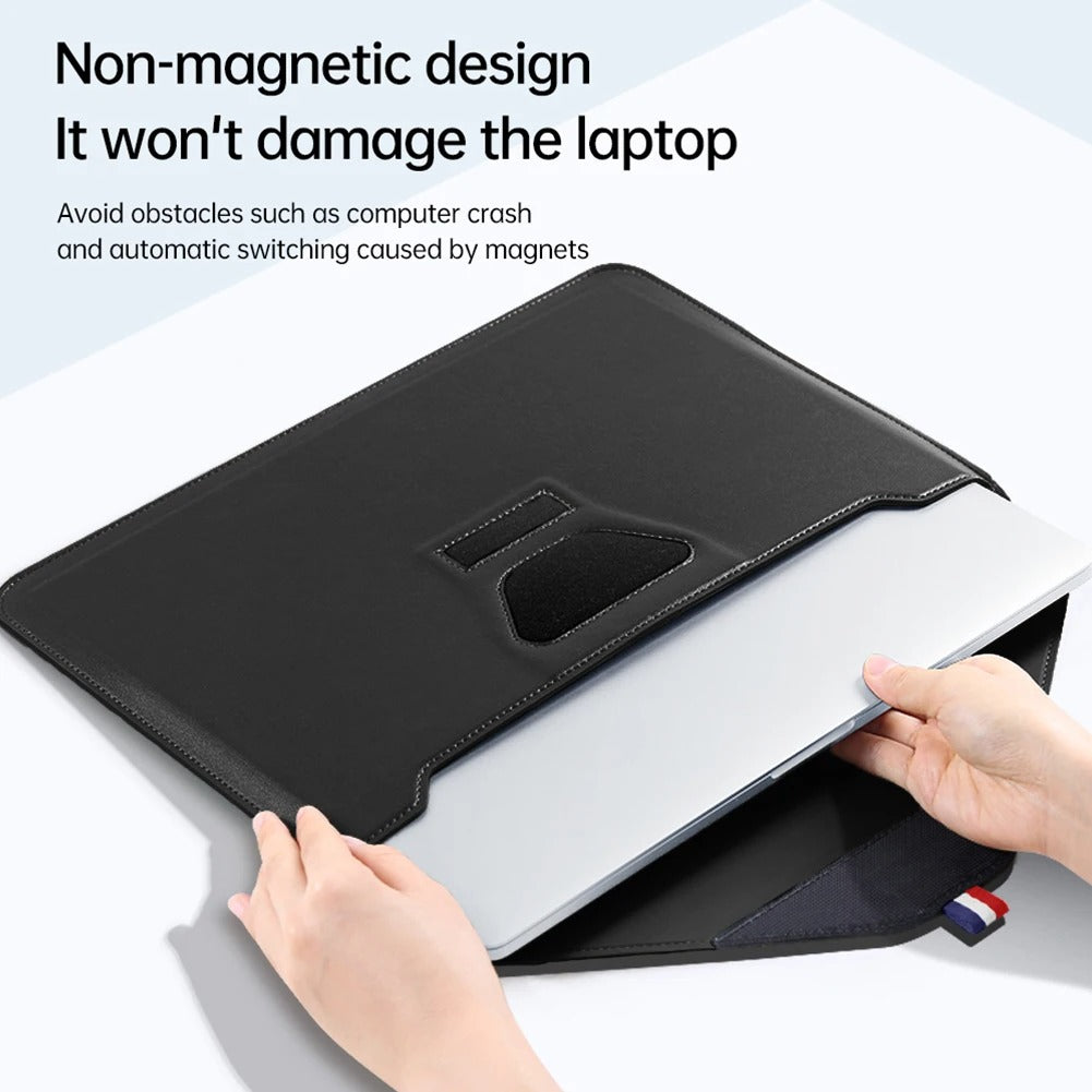 Derrière sa silhouette fine se cache une véritable ingénierie pratique. Grâce à son support intégré, votre MacBook se relève à la bonne hauteur pour un confort de frappe optimal. Le rabat avant se transforme en tapis de souris, créant une mini-station de travail nomade, parfaite pour travailler ou se divertir où que vous soyez. La fermeture velcro discrète assure une manipulation rapide et sécurisée.