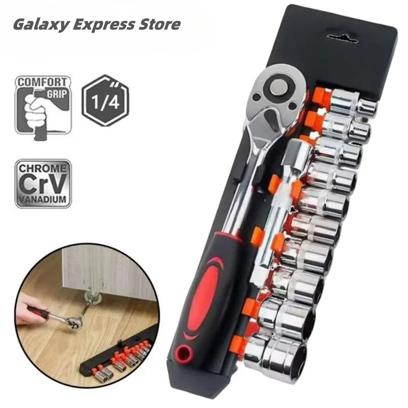 Ce kit complet comprend 1 clé à dégagement rapide, 1 rallonge standard et 10 douilles hexagonales allant de 8 mm à 24 mm, pour couvrir une large gamme d’applications. Que ce soit pour la réparation automobile, l'entretien domestique ou les projets de bricolage, vous aurez toujours la bonne taille à portée de main. La tête d'entraînement autobloquante prévient les chutes accidentelles, rendant votre travail plus sûr et plus rapide. Chaque pièce est forgée avec soin pour garantir robustesse, couple élevé et longue durée de vie.