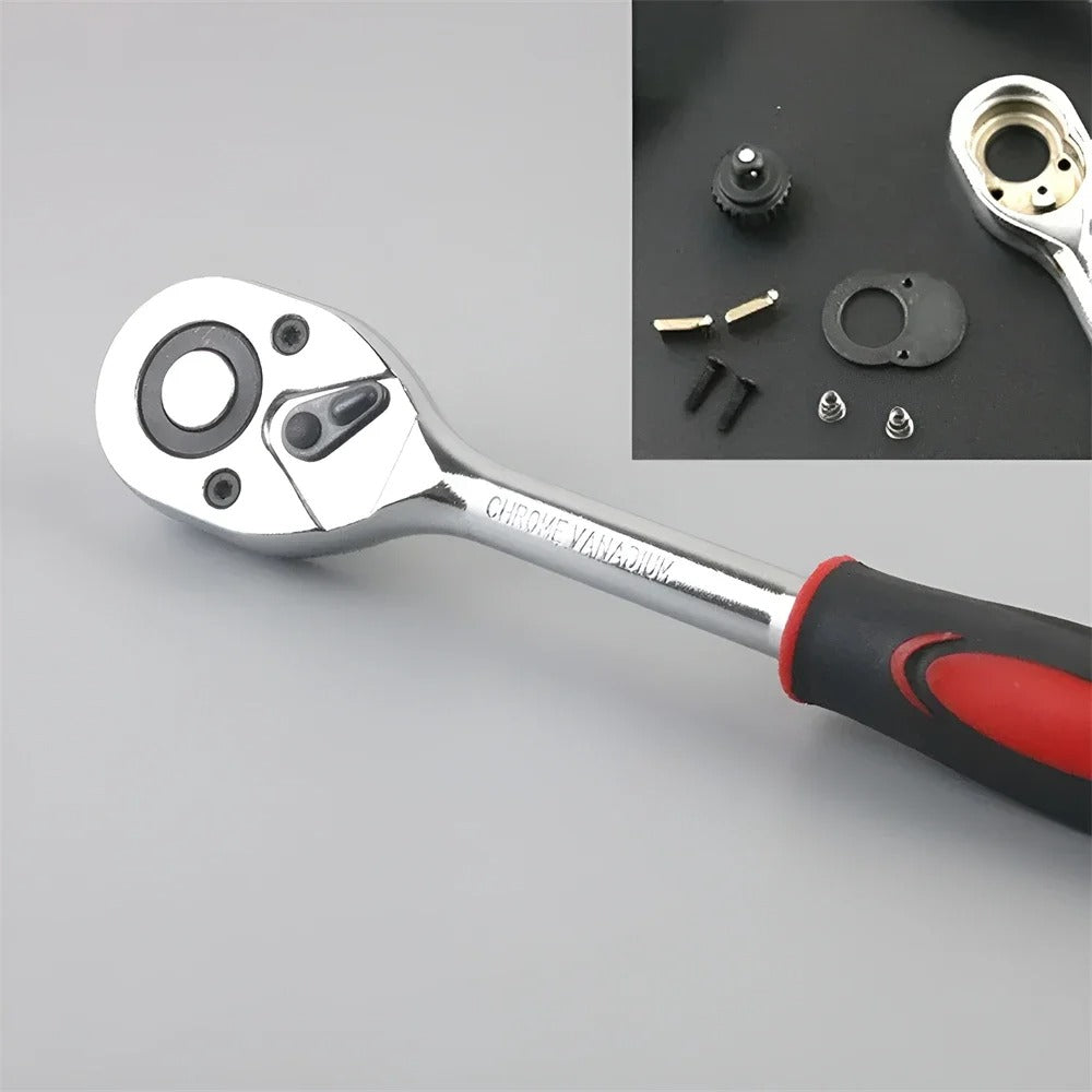 La clé à cliquet réversible à 72 dents garantit un mouvement fluide et précis, même dans les espaces les plus exigus. Sa rotation unique de 5 degrés permet de travailler rapidement sans effort inutile. Dotée d'une poignée ergonomique en caoutchouc thermoplastique, antidérapante et confortable, elle assure une prise en main sécurisée et agréable, même lors d'utilisations prolongées. Le mécanisme de dégagement rapide facilite le changement de douilles en un clic, pour une efficacité accrue à chaque intervention.