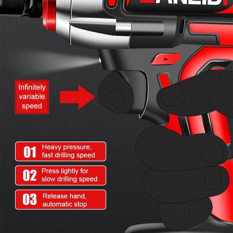 Polyvalent, il s'utilise aussi bien comme perceuse que comme tournevis. Il est parfait pour assembler des meubles, percer du bois ou du métal, et serrer des vis. Son design ergonomique et léger, avec une poignée en caoutchouc, offre un confort maximal et réduit les vibrations, facilitant ainsi une utilisation à une main. L'éclairage LED activé par la gâchette illumine votre espace de travail, rendant chaque tâche plus facile, même dans des conditions de faible luminosité.